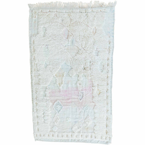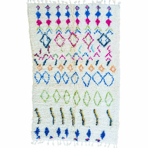The Azilal Berber Tribe produced this piece.  Azilal and Berber carpets are well known for their white natural wool primary colors (the "ground"), along with black or colorful designs for accents.